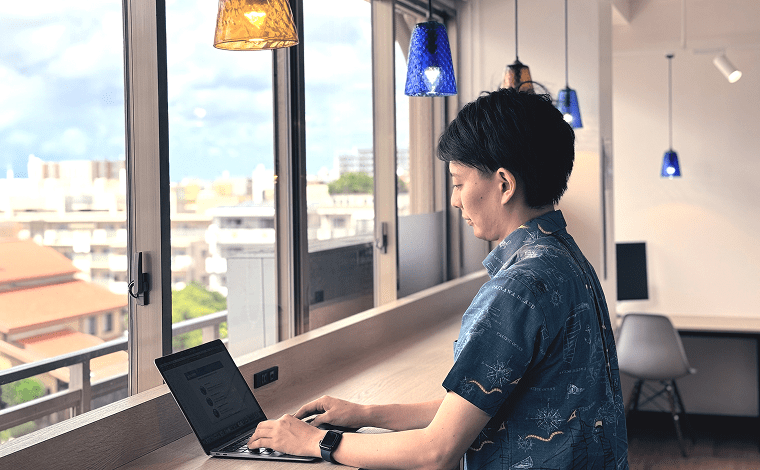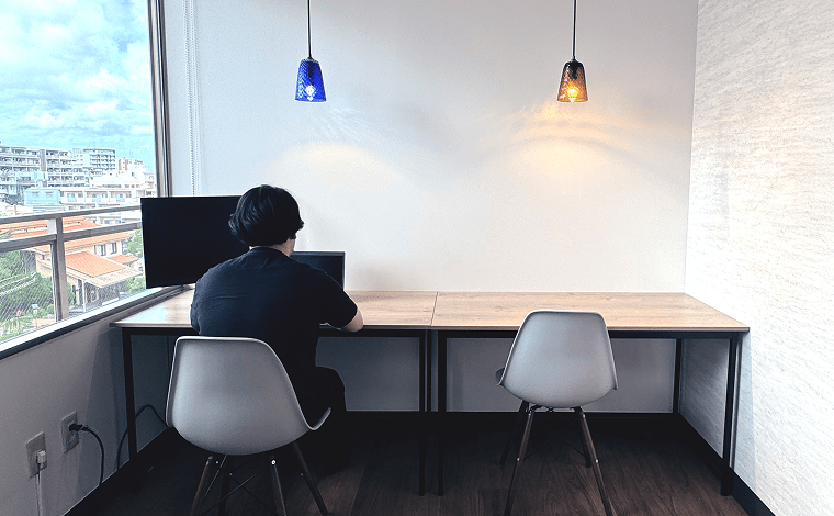 - 運動不足が気になる時や、気分転換などに最適なスタンディグデスクを用意しています。那覇の街並みも眺めながら仕事ができます。